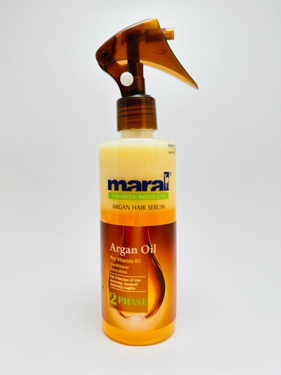 سرم مو دوفاز آرگان مارال به منظور محافظت از مو فرموله شده است و برای انواع مو به ویژه موهای خشک و آسیبدیده مناسب است. مو بر اثر رنگ، دکلره، مواد شیمایی، حرارت و دیگر عوامل آسیب میبیند و دچار خشکی، شکنندگی و حتی مو خوره نیز میشود. سرم دو فاز آرگان با فرمولاسیون ویژه خود ترکیبی از مایع و روغن آرگان است که با تکان دادن آن این دو فاز با هم ترکیب میشوند و سپس میتوانید روی موی خشک یا مرطوب خود استفاده کنید. فرم این محصول به شکل اسپری دو فاز است که استفاده از آن را بسیار راحتتر و سریعتر نموده است. این اسپری موجب تقویت مو، کمک به رفع موخوره، شفافیت، شادابی و استحکام ساقه مو میشود. همچنین پس از استفاده براقیت تارهای مو را افزایش داده و به آنها حجم نیز میدهد.